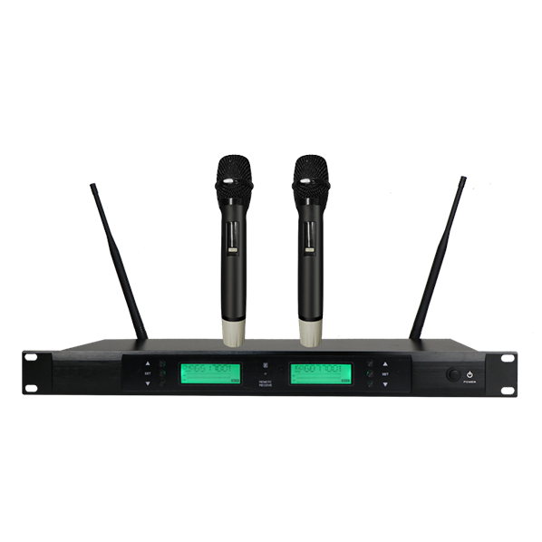 大寬體金屬機箱,合金拉絲面板。兩通道UHF無線系統,每個通道100個頻率可選